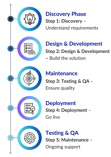Discovery → Solution Design → Configuration → Development → Testing → Deployment → Continuous Optimization.Â